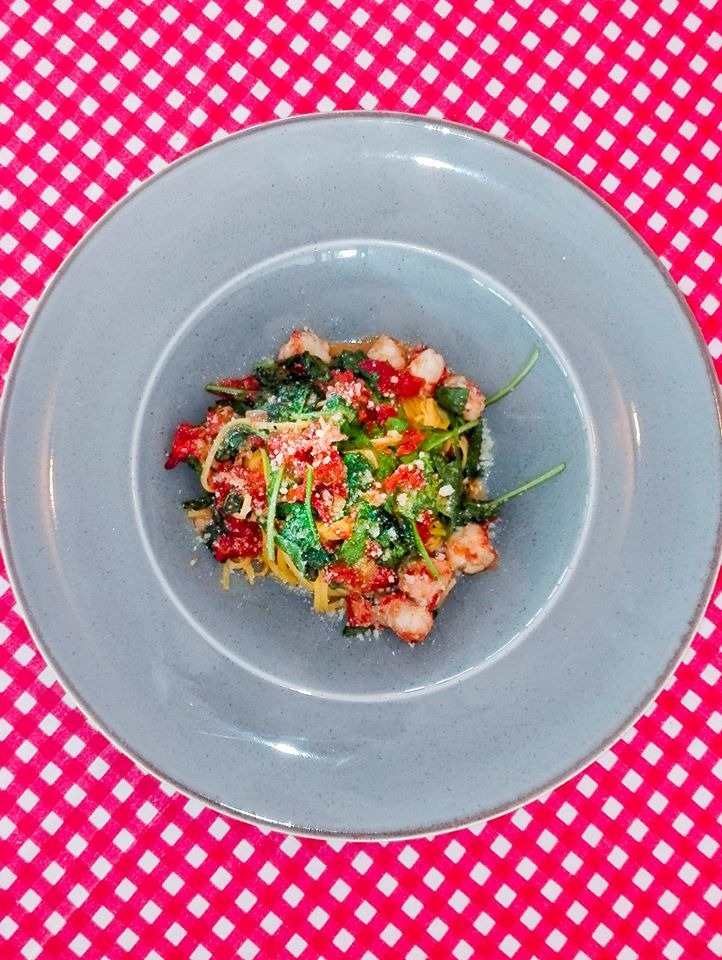 Krewetki / szpinak /suszone pomidory / czosnek / cebula /masło / białe wino / oliwa extra virgin/ rukola / Grana Padano DOP -